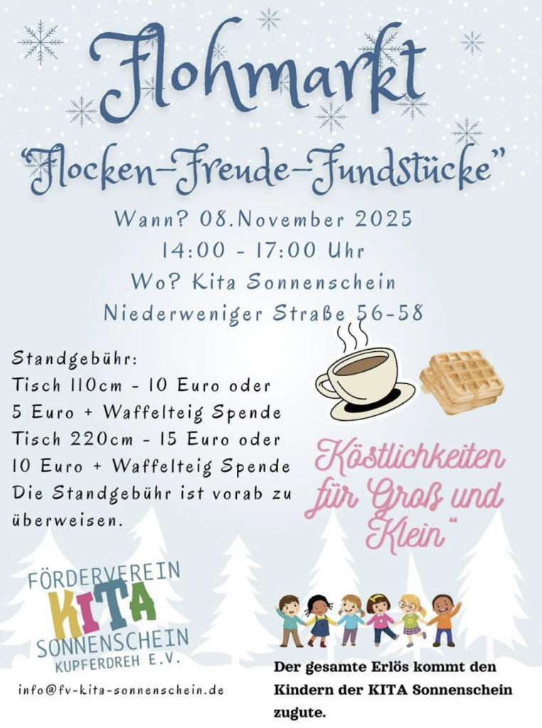 Am Samstag, dem 8.11.2025, findet in der Ev. Kindertagesstätte in der Niederweniger Straße 56–58 wieder unser Flohmarkt von 14:00 bis 17:00 Uhr statt.