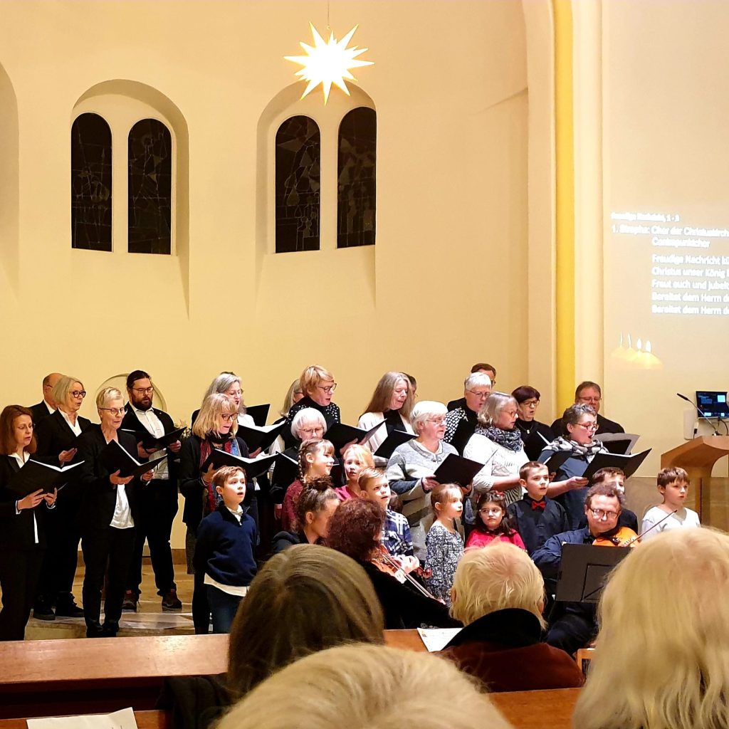 Einmal im Jahr bereiten wir uns, gemeinsam mit dem Frauenchor Contrapunkt auf das traditionelle Adventssingen vor. Hinzu kommen Kantatenaufführungen im Gottesdienst oder auch Konzerte mit Orchester und Solisten, hier öffnen wir uns gern Projektsängerinnen und – sängern oder werden in Zukunft auf benachbarte Chöre zugehen, um größere Werke aufführen zu können.
